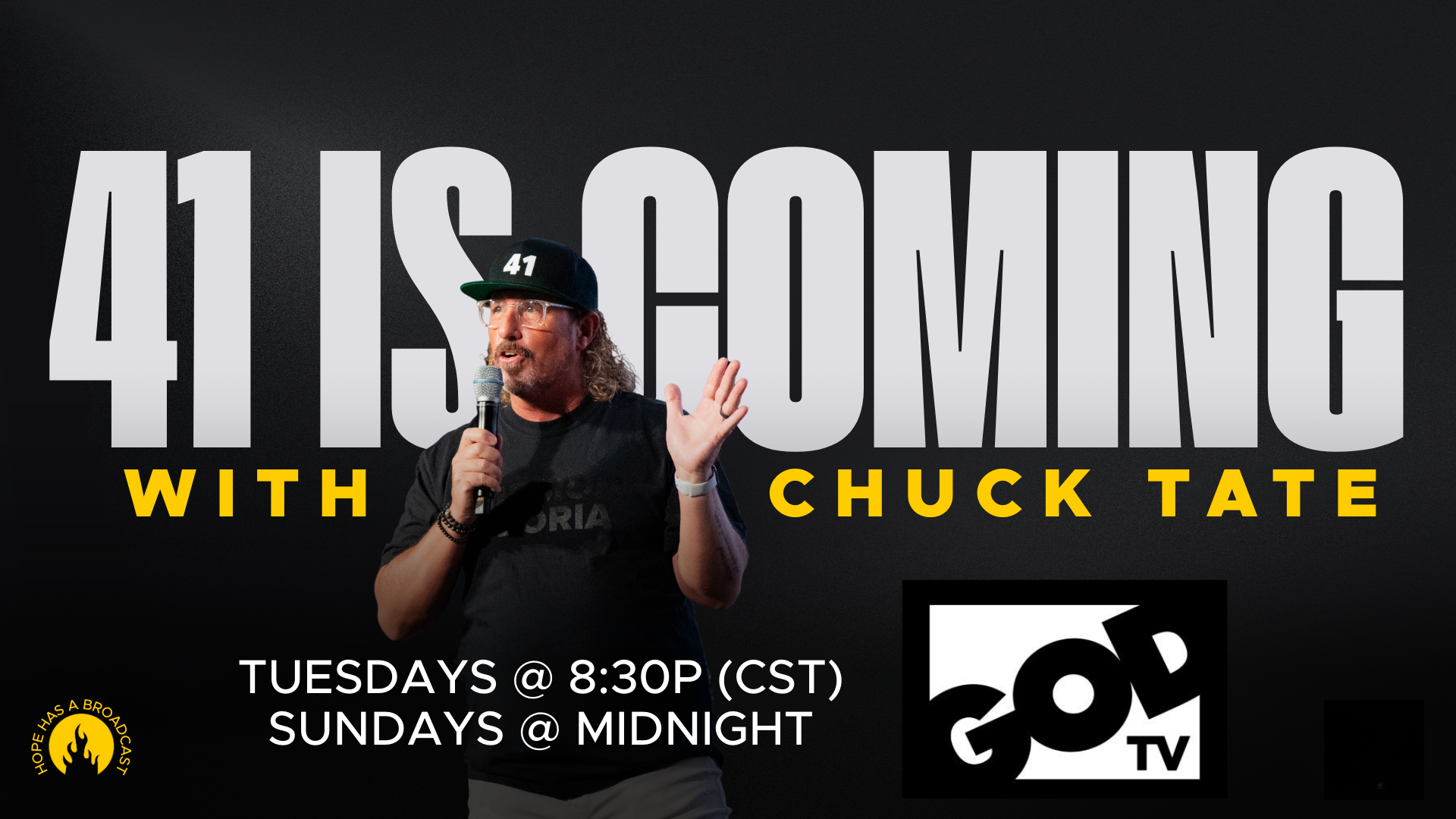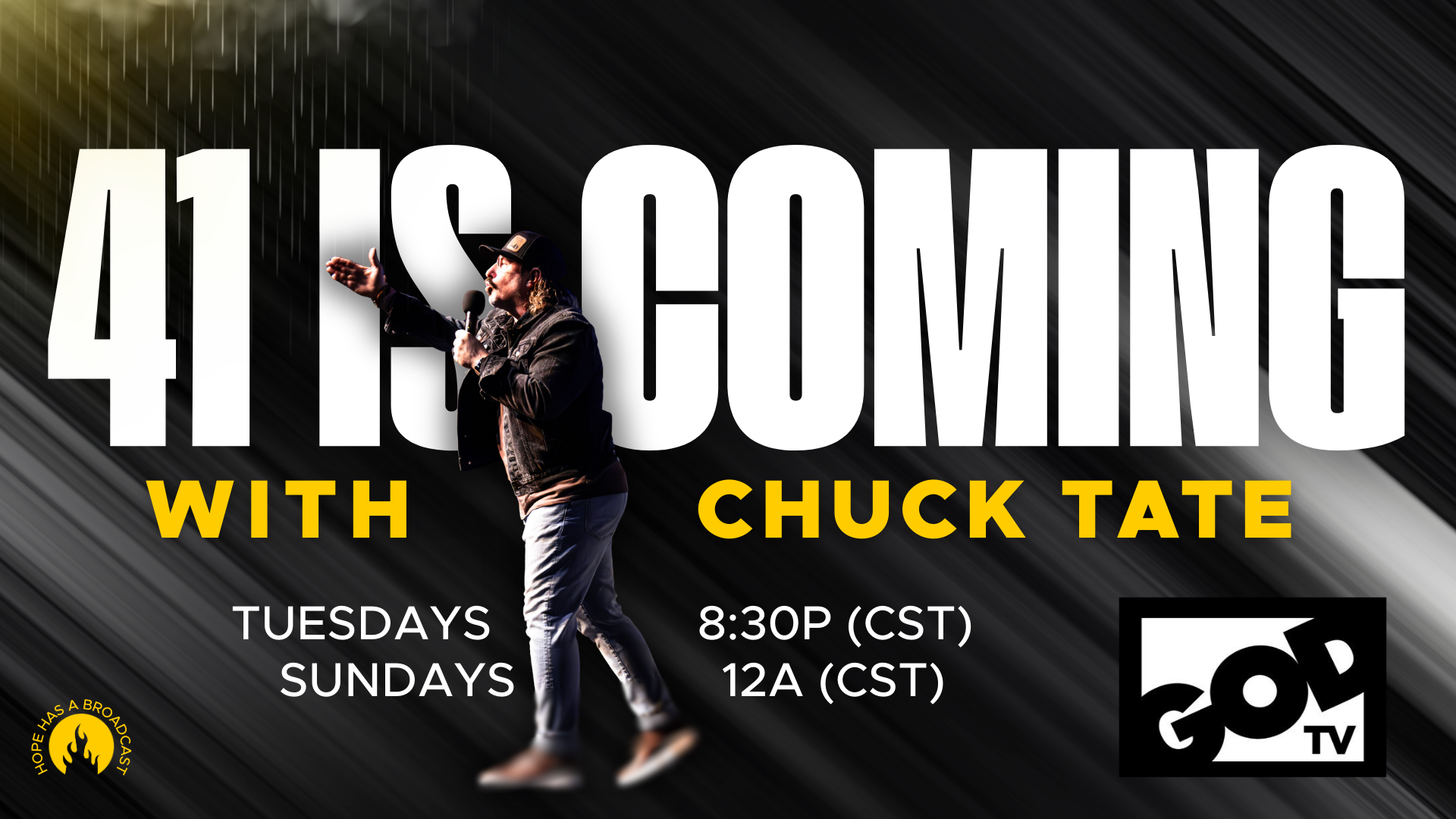 41 Is Coming with Chuck Tate is a 30-minute broadcast that airs twice each week on GOD TV, the third-largest Christian network in the world. With a global reach of more than 500 million connected homes, this program will take the life-changing message of Jesus far beyond the walls of our church in Peoria.